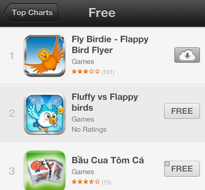 Ngày hôm qua (10/2), tựa game Flappy Bird đình đám đã bị gỡ bỏ khỏi kho ứng dụng App Store. Ngay sau đó, các tựa game được làm nhái lại cách chơi đã được hưởng lợi, tiêu biểu là trường hợp của Fly Birdie - Flappy Bird Flyer khi vươn lên ngôi số 1 của bảng xếp hạng dành cho thiết bị iOS ở khu vực Việt Nam và Mỹ.