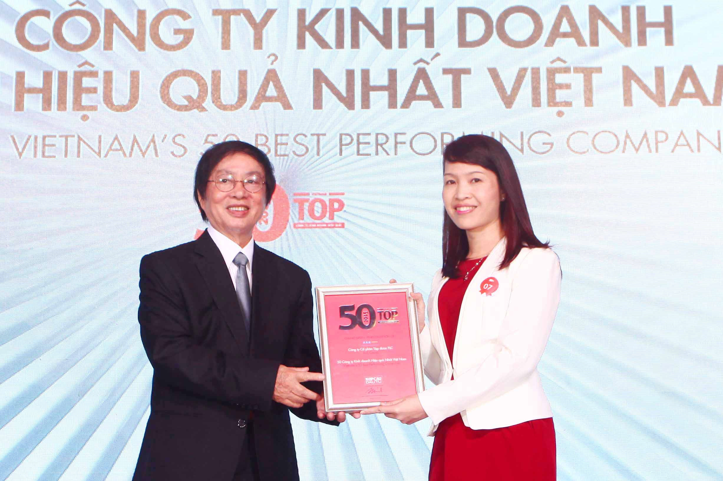| à Trần Thị My Lan, Phó Tổng giám đốc Tập đoàn FLC nhận bằng chứng nhận “Top 50 công ty kinh doanh hiệu quả nhất Việt Nam” từ Trưởng Ban tổ chức Đặng Nhật Minh |