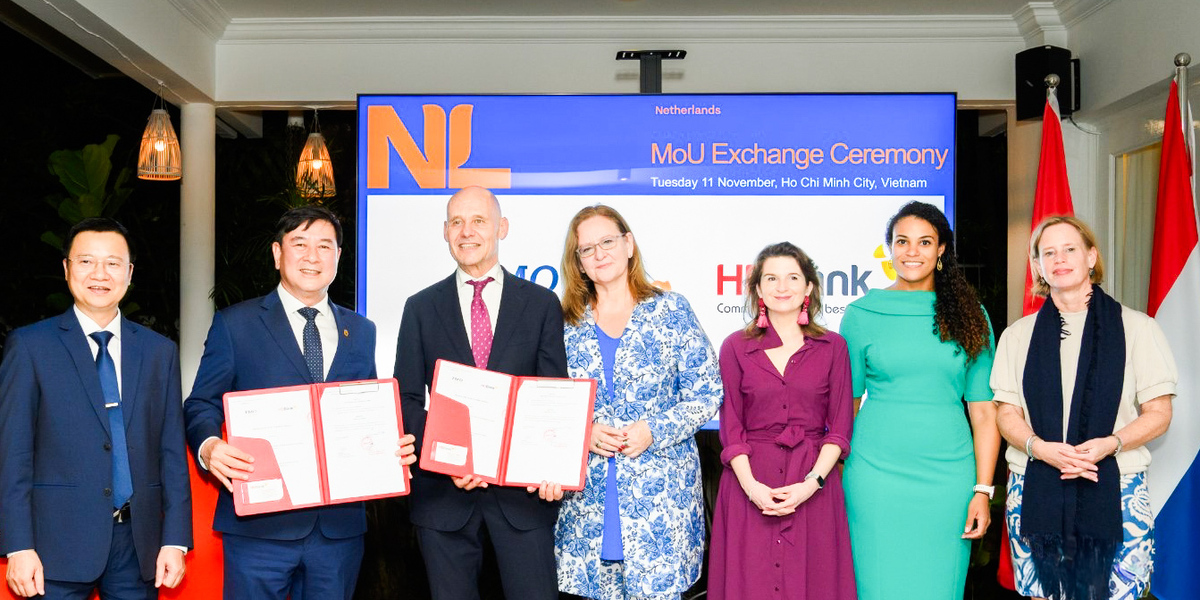 Ngân hàng Phát triển Hà Lan (FMO) và Ngân hàng TMCP Phát triển TP.HCM (HDBank) ký kết Biên bản ghi nhớ (MoU) về hợp tác đầu tư và tài chính bền vững, nhân dịp đoàn doanh nghiệp Hà Lan do bà Aukje de Vries - Bộ trưởng Ngoại thương và Phát triển Vương quốc Hà Lan - thăm và làm việc tại Việt Nam.