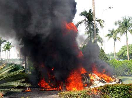 Theo các nhân chứng kể lại, chiếc xe này đang lưu thông trên đường Lê Đức Thọ hướng ra Hồ Tùng Mậu. Đến gần quảng trường Mỹ Đình, xe đột nhiên mất lái, lao lên vườn hoa phân cách giữa đường. Do tốc độ khá lớn, chiếc xe lộn một vòng trên không rồi lật ngửa. Rất may người đàn ông trung niên lái xe đã chui được ra ngoài, trước khi chiếc xe bắt đầu bốc cháy.