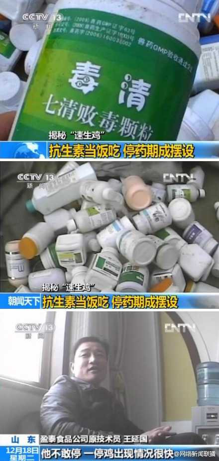 Điều tra của đài CCTV cũng cho hay, một số trang trại nuôi gà với thuốc cấm để tăng tốc độ sinh trưởng. Một loại thuốc bị cấm sử dụng kích thích gà ăn để tăng cân nhanh.Thậm chí, tại các trang trại, hang chục ngàn con gà sống trong điều kiện chật chội.