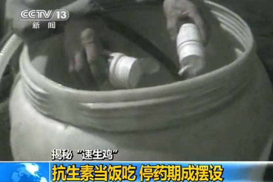 Cũng theo đài này, một số nhà cung cấp gia cầm tại Sơn Đông (Trung Quốc) dùng hóa chất độc hại để gà tăng trưởng nhanh. Hình ảnh phóng viên CCTV ghi được cho thấy, một người làm việc tại trang trại đổ chai thuốc chứa phụ gia vào thức ăn cho gà.
