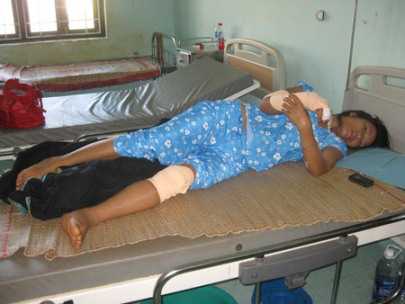 | Chị Đoàn Thị Trúc bị chồng chém đứt hai ngón tay, vỡ xương đầu gối. |