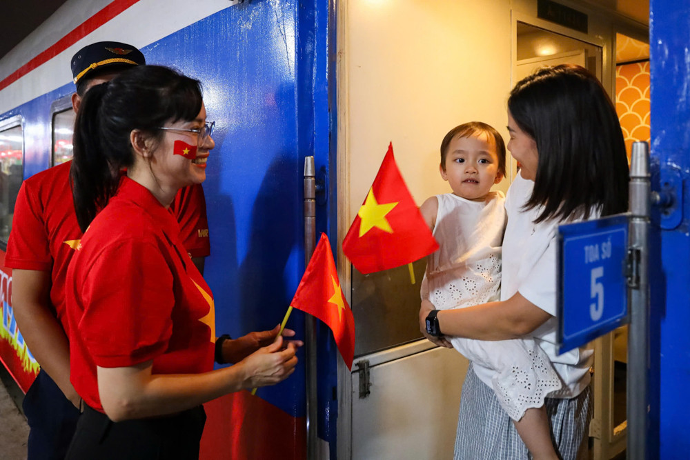 Hàng trăm hành khách trong trang phục áo, cờ đỏ sao vàng rực rỡ đứng xếp hàng trước sân ga, tay cầm cờ nhỏ vẫy cao, nở nụ cười phấn khích khi chuẩn bị bước lên chuyến tàu lịch sử.