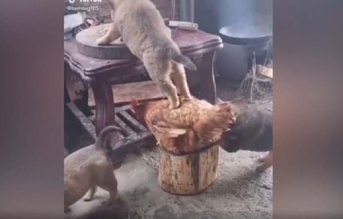 Với sự trợ giúp ăn ý của gà, chú chó chén trộm toàn bộ thức ăn trên thớt.