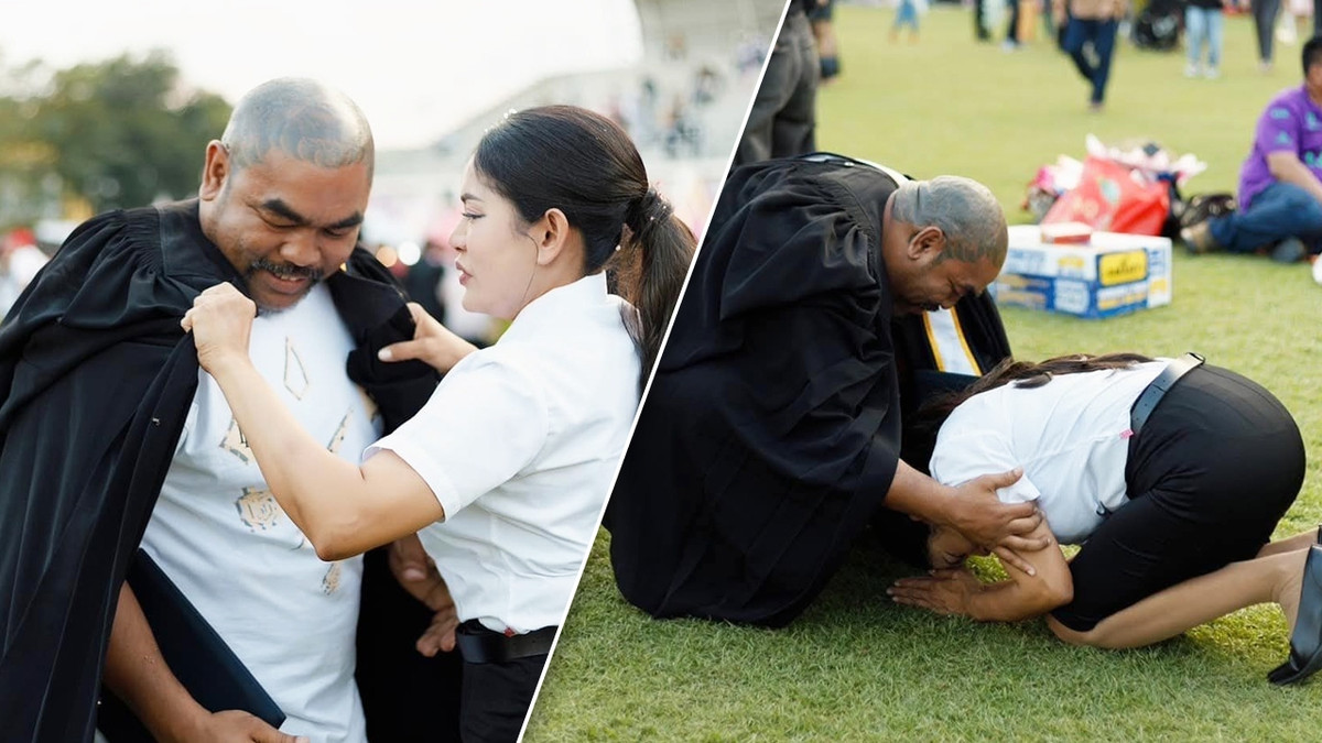 Khoảnh khắc vợ của Chaloemporn Sawatsuk khoác áo cử nhân cho chồng và quỳ xuống cảm ơn gây xúc động trên mạng xã hội. Người chụp và đăng bức ảnh này lên chính là một giám ngục làm việc trong nhà tù nơi võ sĩ từng thụ án trước đây.