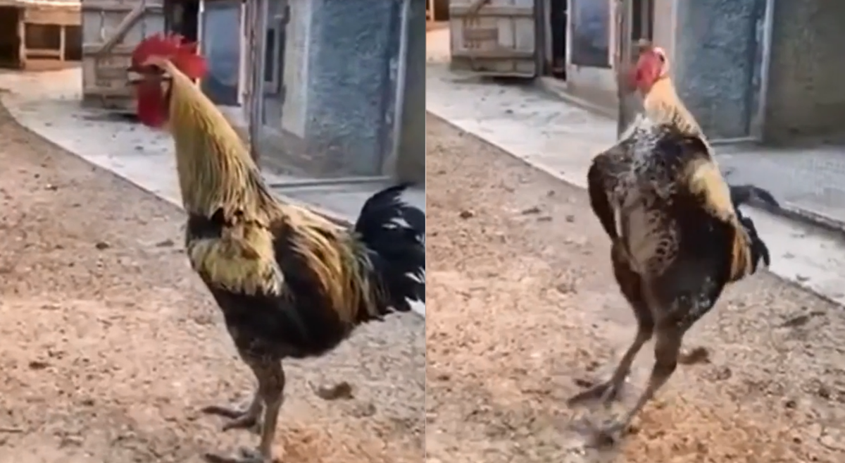Cất tiếng gáy cả tràng dài, chú gà trống ngã ngửa ra phía sau vì quá mệt.