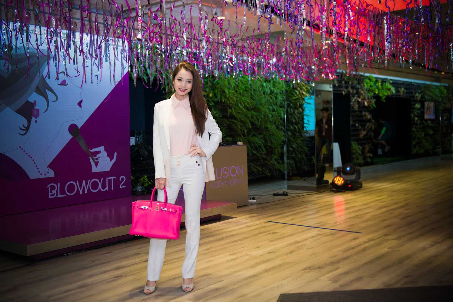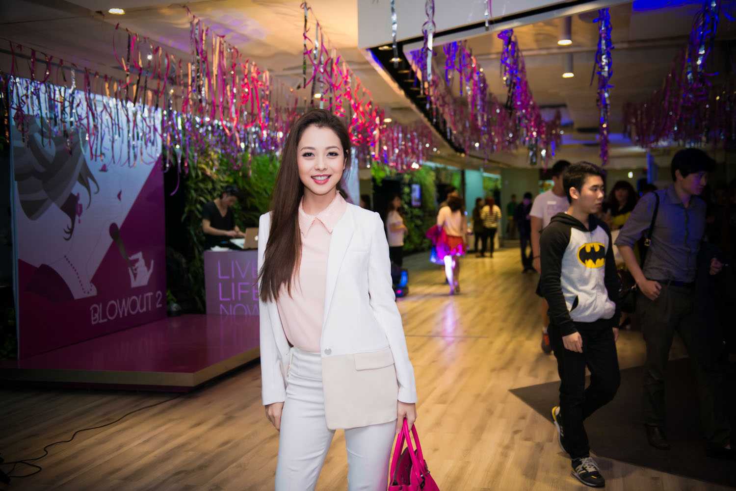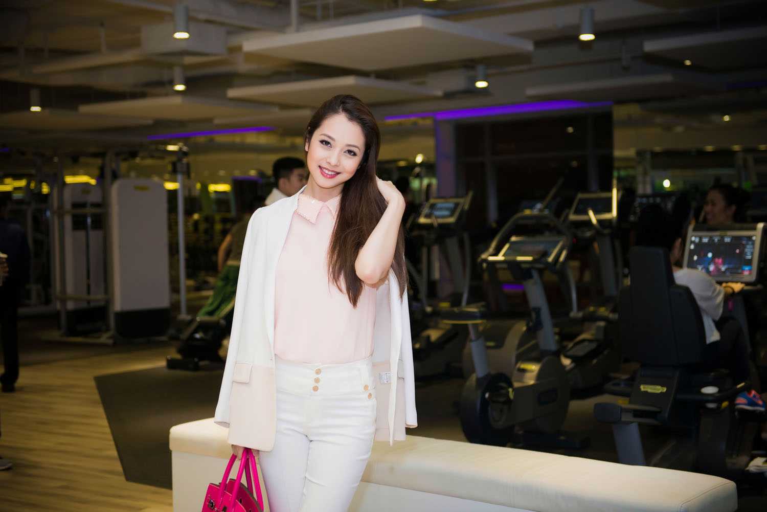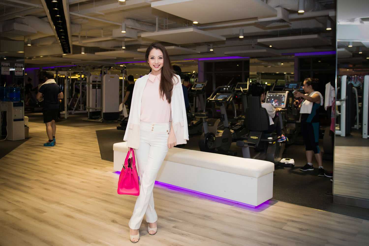 Chiếc túi xách đắt tiền màu hồng là điểm nhấn khiến cho trang phục của cô nổi bật hơn rất nhiều.