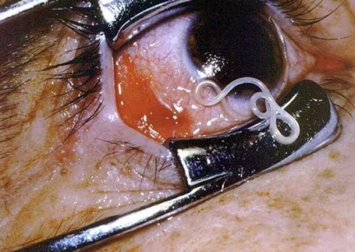 Loa Loa (sán mắt châu Phi) thâm nhập cơ thể qua vết thương mở của loài ruồi trâu và ẩn náu trong cơ thể, vài năm sau đó thâm nhập lên mắt, làm cho người bệnh ngứa ngáy khó chịu. Nếu soi gương có thể phát hiện thấy có sán bò dưới bề mặt nhãn cầu.