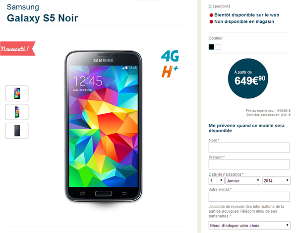 Theo mẫu quảng cáo vừa xuất hiện trên website chính thức của nhà mạng Pháp Bouygues Telecom, Galaxy S5 bản 16GB có giá mua đứt là 649 Euro tương đương với gần 19 triệu đồng.