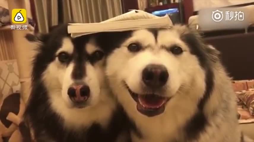2 chú chó nghịch ngợm gặm nát sách, bị chủ phạt cùng nhau đội 1 quyển sách trên đầu trong vòng 2 tiếng, nếu không sẽ phải nhịn bữa tối.