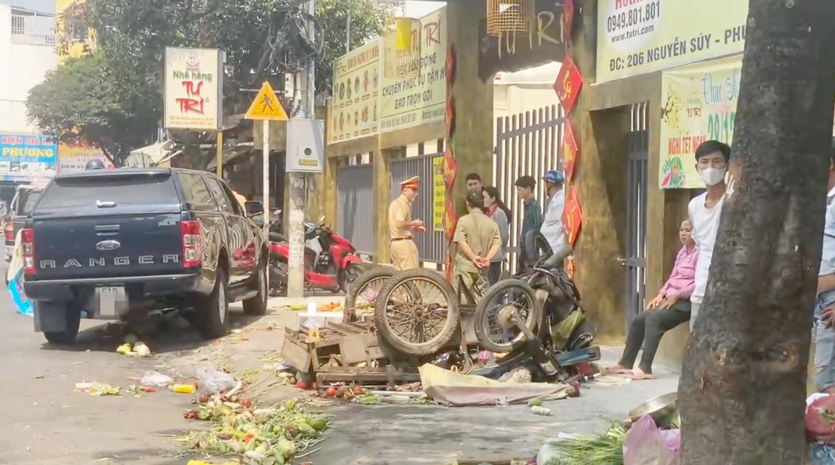 Khi đến trước số 206 Nguyễn Súy, phường Tân Quý (quận Tân Phú), xe ô tô bán tải bất ngờ tông một shipper đang giao hàng, kéo lê nạn nhân hơn 1m và tông tiếp xe ba gác bán rau củ sát lề đường. Chưa dừng lại, phương tiện này còn lao lên vỉa hè, tông tiếp vào tủ bán rau câu ven đường.