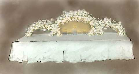 | Phác họa trang trí bàn tiệc dài và bàn tiệc tròn trong đám cưới Tú Vi - Văn Anh. |