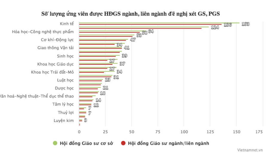 Trong đó, ngành Kinh tế có 17 trường hợp không đạt, gồm 4 ứng viên giáo sư và 13 ứng viên phó giáo sư, là ngành có số lượng ứng viên không qua vòng xét duyệt của Hội đồng Giáo sư ngành, liên ngành nhiều nhất.