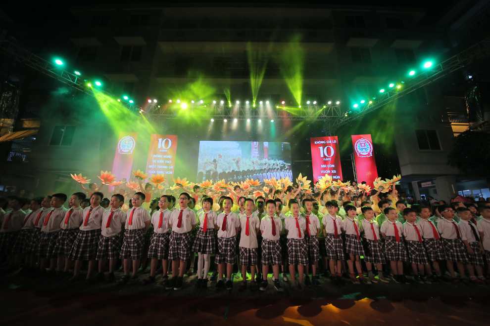 Hàng trăm học sinh cùng đứng trên sân khấu tôn vinh các thầy cô nhân ngày Nhà giáo Việt Nam và kỷ niệm 10 năm thành lập hệ thống giáo dục Lê Quý Đôn