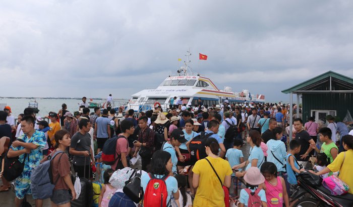 Sau khi gỡ lệnh cấm, rất đông du khách tập trung tại cảng chờ tàu để trở về đất liền.