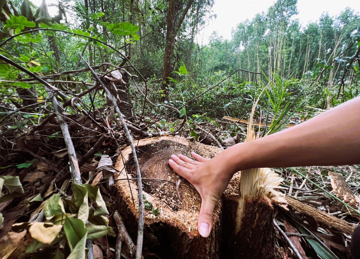 Nhiều gốc keo lớn bị cưa sát gốc nằm chủ yếu ven hồ. Dấu vết để lại cho thấy thủ phạm sử dụng máy cưa để hạ gốc cây, rồi cắt khúc để dễ bề vận chuyển ra khỏi rừng.