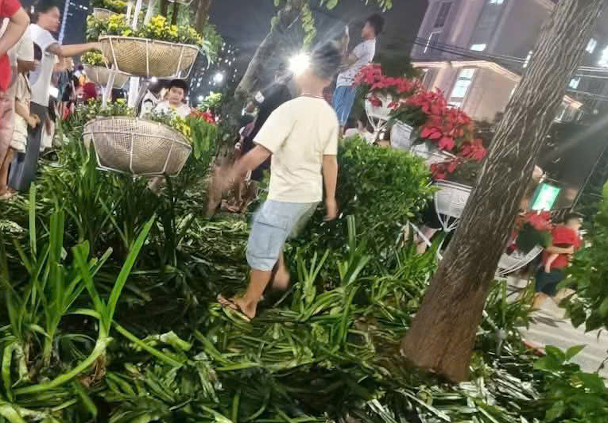 Luống hoa mới trồng chuẩn bị cho ngày lễ lớn bị người dân giẫm nát.