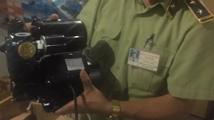 Ngoài lượng lớn máy bơm, đoàn kiểm tra còn phát hiện 3.500 bóng chíp điện tử và 43kg nhãn mác có chữ "Made in Vietnam". Toàn bộ sản phẩm đều là hàng mới, chưa qua sử dụng.