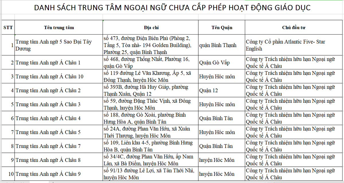 Danh sách Trung tâm ngoại ngữ chưa cấp phép hoạt động giáo dục.