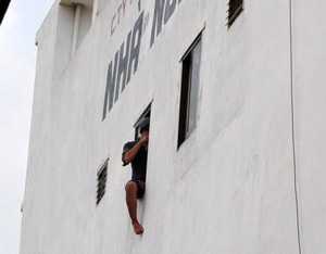 | Nam thanh niên leo cửa sổ tầng 3 nhà nghỉ đòi nhảy xuống tự tử (Ảnh: Tấn Vũ-Báo Tuổi Trẻ) |