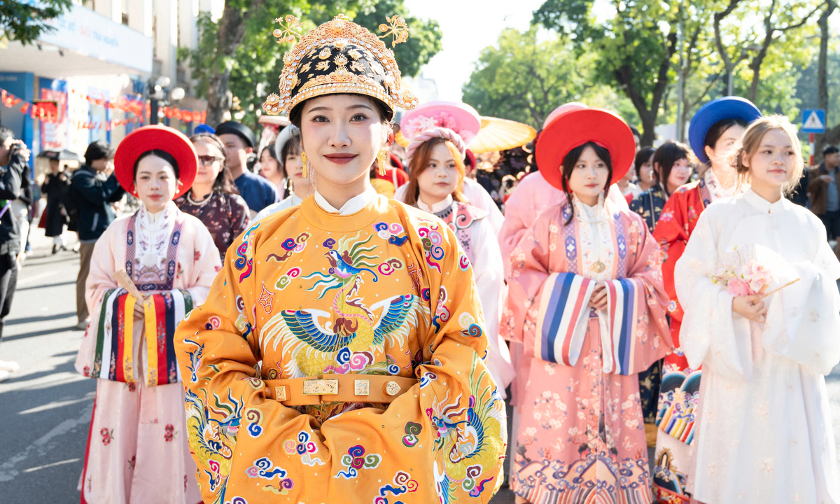 Đoàn diễu hành rực rỡ sắc màu truyền thống di chuyển qua các tuyến phố quanh Hồ Hoàn Kiếm và khu vực Quảng trường Đông Kinh Nghĩa Thục, tạo nên không gian văn hóa sống động giữa mùa thu Hà Nội.