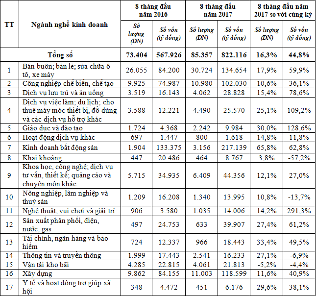 Như vậy, tính chung 8 tháng đầu năm 2017, tổng số doanh nghiệp thành lập mới và doanh nghiệp quay trở lại hoạt động của cả nước là 104.511doanh nghiệp, trong đó có 85.357 doanh nghiệp thành lập mới và 19.154 doanh nghiệp quay trở lại hoạt động.