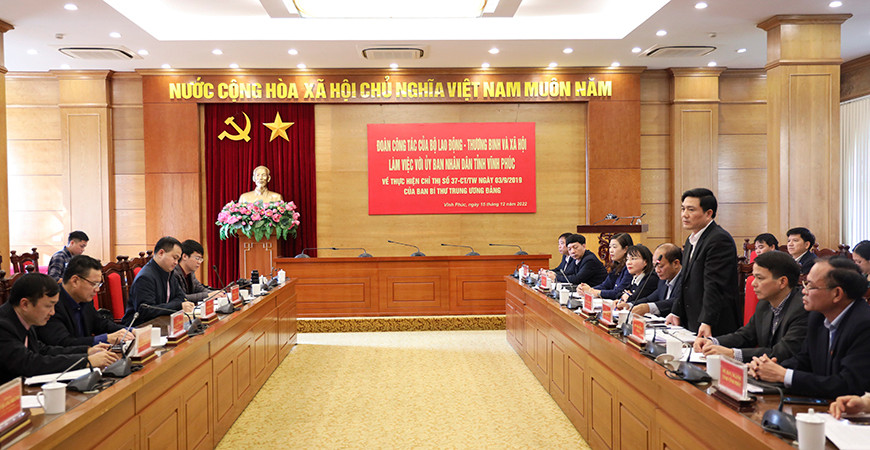 Chiều 15/12, Thứ trưởng Bộ LĐ-TB&XH Lê Văn Thanh làm việc với UBND tỉnh Vĩnh Phúc về thực hiện Chỉ thị số 37 của Ban Bí thư Trung ương Đảng về tăng cường sự lãnh đạo, chỉ đạo xây dựng quan hệ lao động hài hòa, ổn định và tiến bộ trong tình hình mới; tình hình thực hiện chính sách lao động, việc làm, tiền lương, thu nhập và bảo đảm đời sống người lao động trong các doanh nghiệp dịp cuối năm và Tết Nguyên đán 2023.