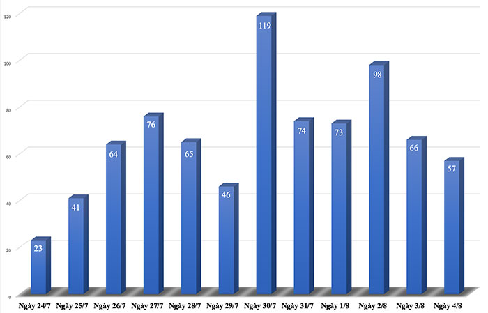 Hôm nay là ngày thứ 13 Hà Nội thực hiện giãn cách xã hội. Nhìn biểu đồ số ca COVID-19 có thể thấy, những ngày đầu thực hiện giãn cách số ca mắc tăng lên dù không nhiều. Nhưng đến 30/7, số người dương tính mới tăng vọt lên 119, gồm 58 người ở khu cách ly tập trung và 61 người được phát hiện tại cộng đồng.