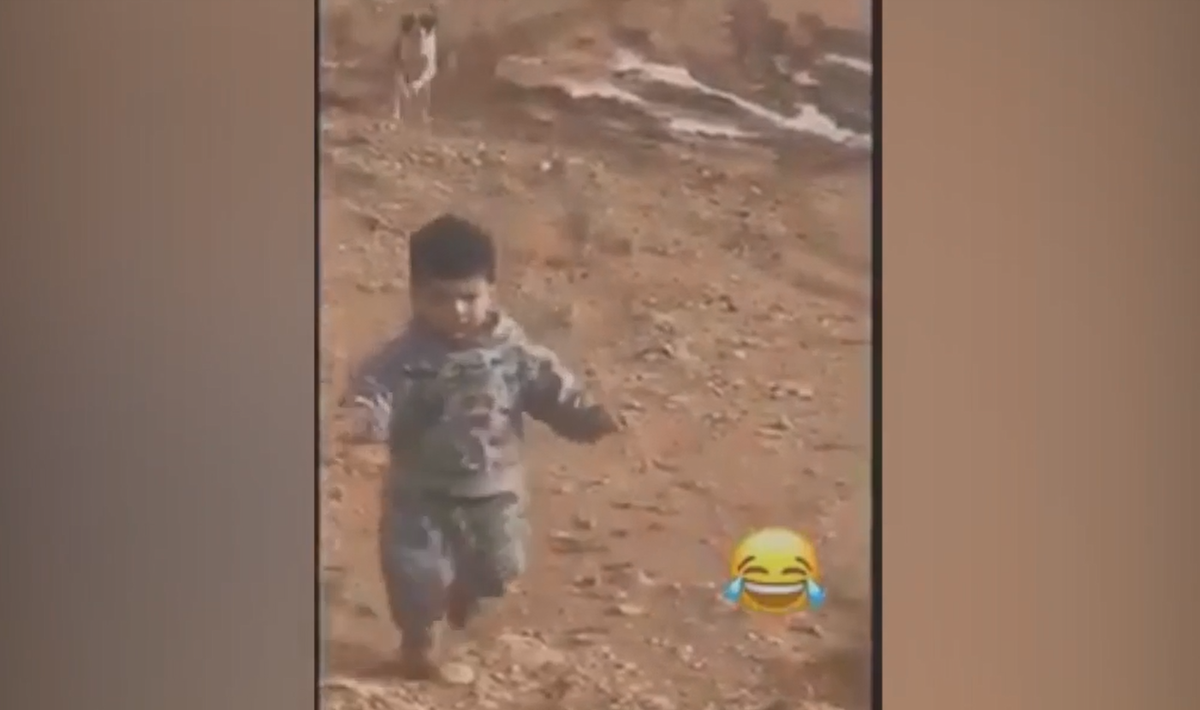 Hùng hổ tiến về phía trước để đe doạ lũ chó nhưng khi bị chó đuổi, cậu bé khóc ré lên rồi quay lưng bỏ chạy.