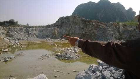 | Một người dân chỉ hồ rộng cả héc ta do khai thác đá trái phép tạo thành |