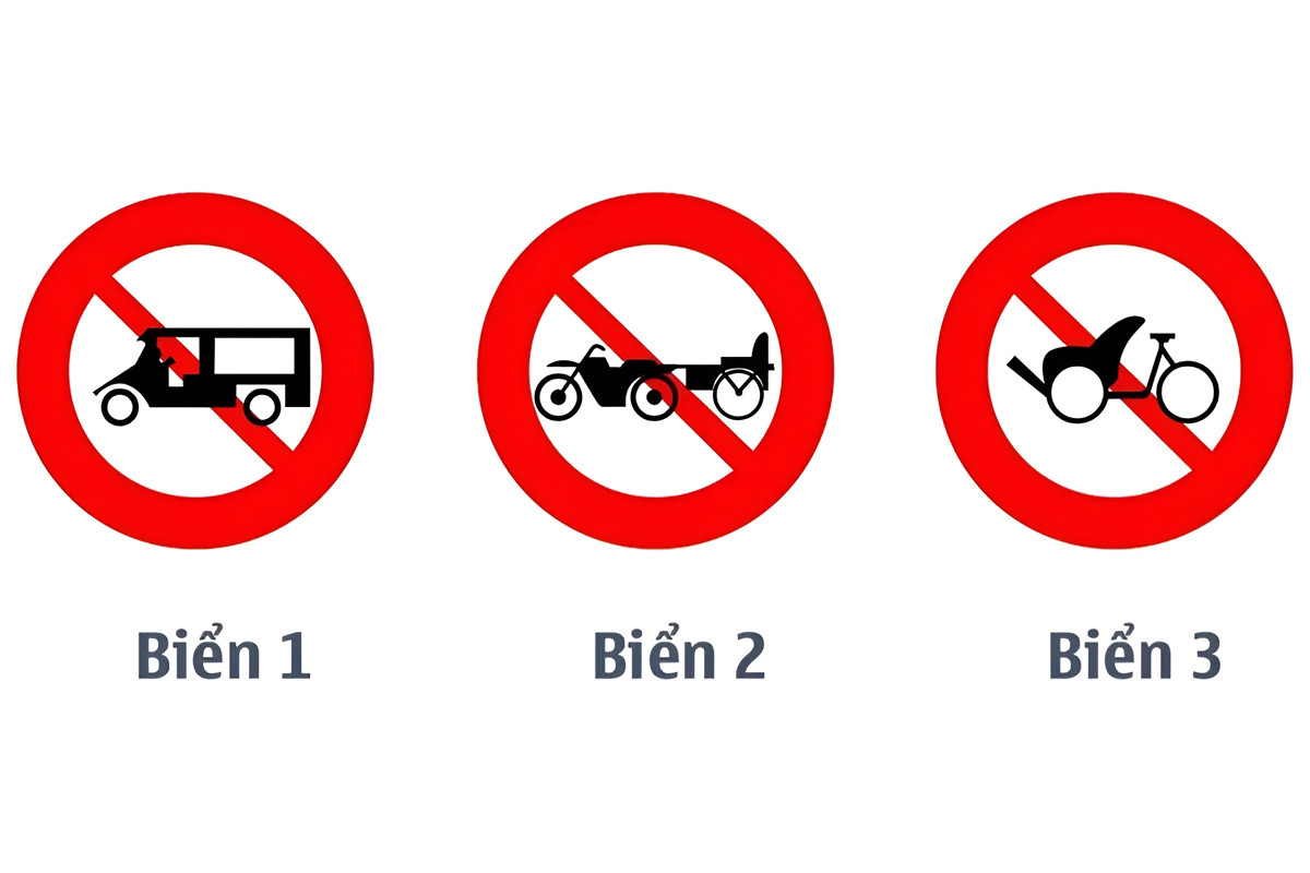 - Biển 3 là biển "cấm xe ba bánh loại không có động cơ" (được ký hiệu P.111d), báo đường cấm xe ba bánh loại không có động cơ như xích lô, xe lôi đạp...