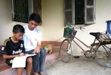 | Tranh thủ những ngày chưa nhập trường, Tráng ở nhà dạy em trai học thêm ở nhà. |