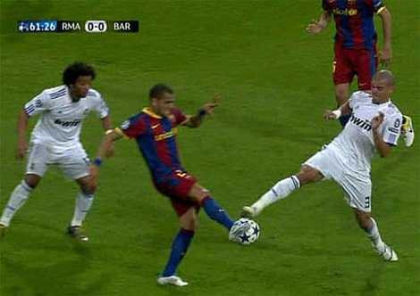Kịch tính và tranh cãi nhất là tấm thẻ đỏ của Pepe sau khi cầu thủ người Bồ Đào Nha có pha vào bóng với Daniel Alves ở trận bán kết lượt đi Champions League mùa giải 2010/11. Nhưng pha quay chậm cho thấy, dường như cầu thủ người Brazil đã diễn kịch quá tốt khiến học trò của Mourinho phải cay đắng rời sân.