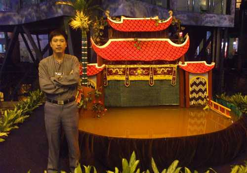 Nghĩ là làm. Anh cải tạo lại tầng 4 của gia đình, trước là nơi giặt và phơi phóng quần áo thành một cái nhà hát thu nhỏ. Ban đầu chỉ ai biết mới đến xem. Mãi tới gần đây anh mới đầu tư “nâng cấp” trang trí sân khấu có mái đình đỏ, bể nước hình bán nguyệt quây bằng tôn, có cây đa, khóm tre vàng.