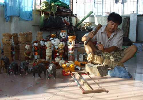 “Thế những lúc không có khách, anh làm gì?”, tôi hỏi. “Làm những con rối này”, anh chắp tay sau lưng nhìn một vòng xung quanh những cô tiên, chú tễu, mục đồng cưỡi trâu… bày la liệt chung quanh. Quả thật, những lúc không có khách anh Liêm vẫn lọ mọ làm con rối để bán. Thấy tôi tò mò, xoay ngang xoay ngửa con rối trên tay, anh giải thích tỉ mỉ, con rối bây giờ được làm từ gỗ sung. Gỗ sung có ưu điểm nhẹ, đóng đinh không vỡ nhưng phải cái ngâm dưới nước nhanh mục. Ngày xưa các cụ chủ yếu dùng gỗ mít và gỗ xoan, nhưng hai loại gỗ này nặng, làm những con rối nhỏ thì cầm được chứ loại rối to thì phải dùng miếng bọt biển hoặc xốp làm đế để dễ nổi.