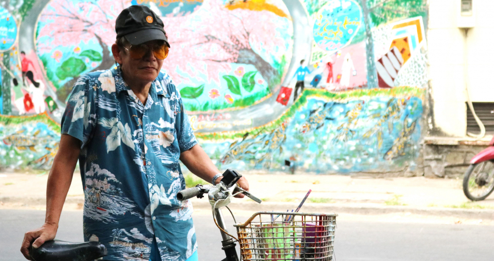 Ngày ngày với chiếc xe đạp cũ kĩ, trước giỏ là những hộp sơn màu, ông Minh đi “thay áo mới” cho những bức tường trống khắp các phố phường Sài Gòn.