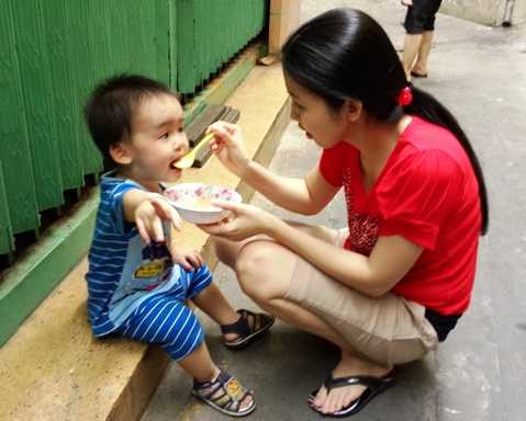| Chị Thư đang cho bé Huynh ăn cháo. Ảnh: Phan Cường |