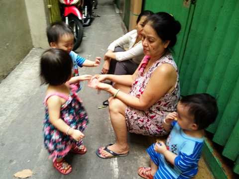 Khi thấy những ngườihàng xóm đi học hay đi làm về, các bé chạy ùa vào nắm quần, kéo áo, ríurít khiến mọi người ai cũng thấy vui.