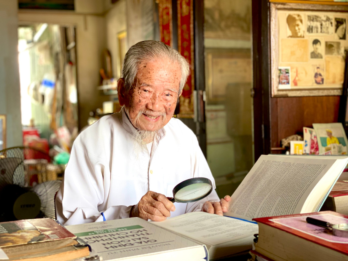 Con hẻm nhỏ trên đường Chu Văn An, quận Bình Thạnh, TP.HCM dẫn chúng tôi đến căn nhà tĩnh lặng của cụ Nguyễn Đình Tư. Trước mắt chúng tôi, cụ ông tuổi 105 ngồi bên bàn làm việc, xung quanh là chồng sách cao ngất với những trang được lật dở ngập mùi giấy cũ…