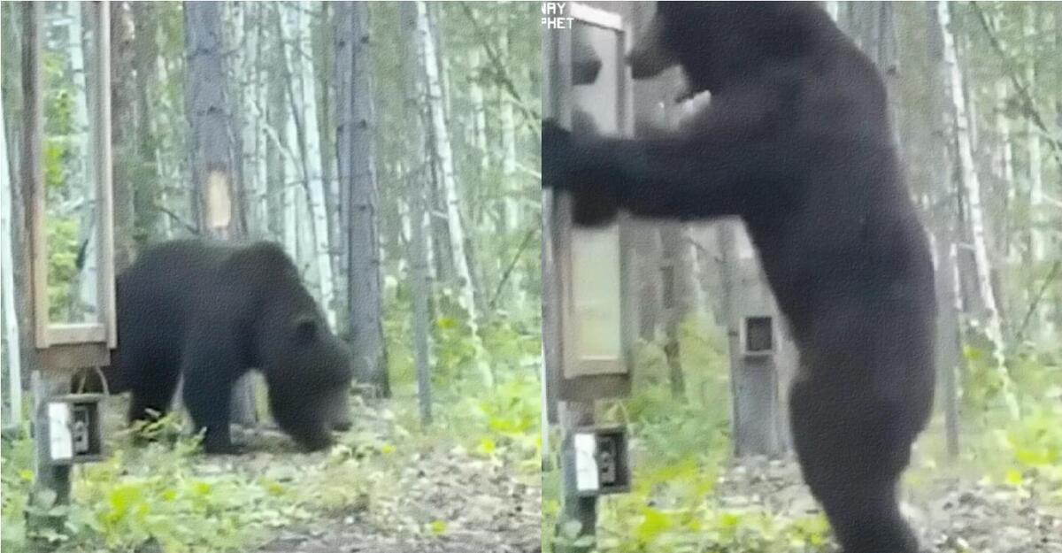 Gấu giật bắn người, hoảng loạn khi thấy mình trong gương