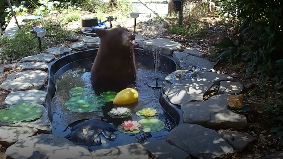 Con gấu hoang lẻn vào sân vườn của nhà người dân tắm dưới bể và vui đùa với vòi phun nước, hành động của nó đã bị camera an ninh ghi lại.