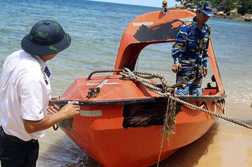| Chiếc xuồng cứu sinh bị bọn chúng dùng sơn đen sơn phủ số và ký hiệu để thuận tiện trốn thoát. Ảnh: Thanh Nghị. |