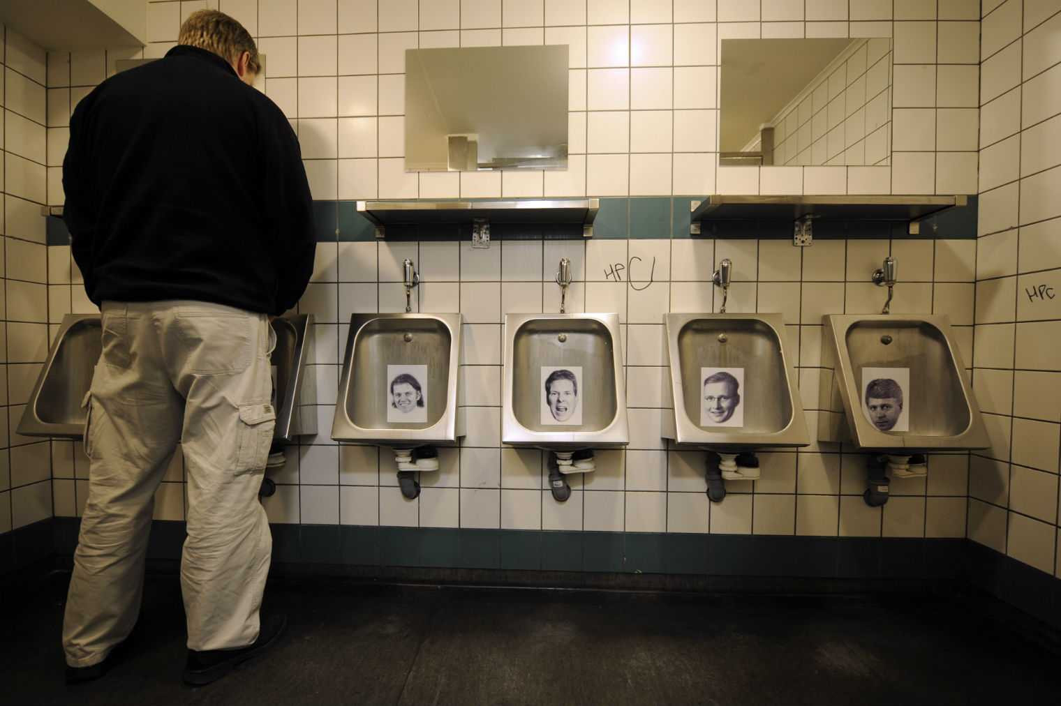 | Các chủ ngân hàng có vai trò trong cuộc khủng hoảng tài chính 2008 bị dán ảnh trong bồn cầu ở các nhà vệ sinh công cộng tại Iceland. |