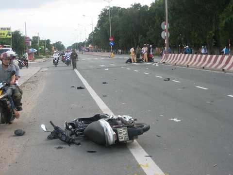 | Hiện trường hai chiếc xe máy nằm cách xa nhau 20 mét, chiếc ô tô (chưa rõ BKS) gây tai nạn đã tháo chạy khỏi hiện trường |