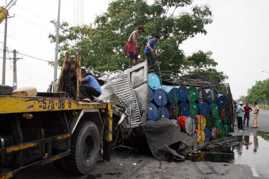 Vụ tai nạn đã khiến tài xế Cường, người cầm lái xe tải bị thương nặng, được người dân đưa đi cấp cứu trong tình trạng nguy kịch.Dàu nhớt chảy loang lỗ trên Đại lộ Nguyễn Văn Linh