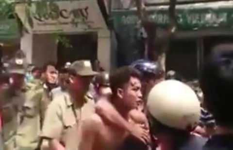 | Tài xế taxi bị một số người dân lột áo, hành hung. |