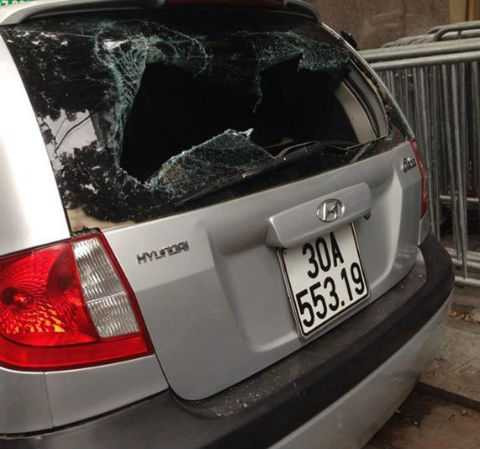 | Chiếc taxi bị người dân đập vỡ kính. |