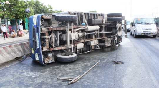 Sự cố khiến xe tải lật ngang đường. Hai bánh xe của trục bị gãy lao tự do trên đường gần 100 m mới chịu dừng lại khiến nhiều ô tô né tránh.