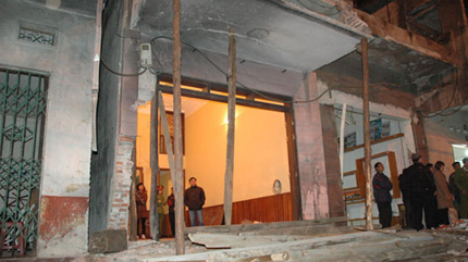 Tối 7/1, lực lượng chức năng tiến hành chống đỡ phần mái hiên nhà đại tá Nguyễn Như Tuấn và một số ngôi nhà kế bên bị phá tan hoang sau vụ nổ - Ảnh: Quang Thế